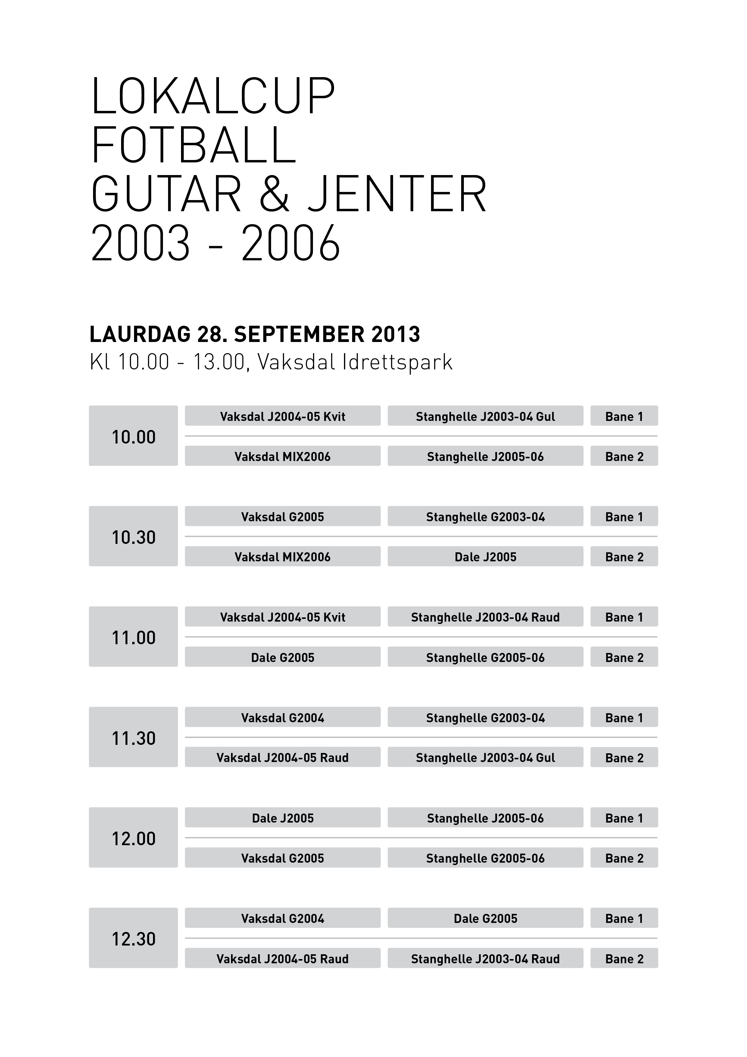Laurdag 28. september arrangerer Vaksdal IL lokalcup for dei yngste spelarane. Dette er den siste av tre cupar, dei to første vart arrangert på Stanghelle og Dale i vårsesongen. Cupen varer frå kl 10.00 – 13.00, og det vert open kafé.