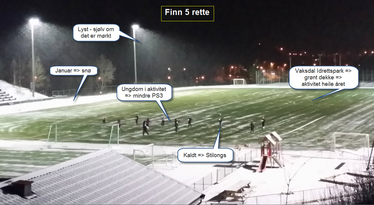Frå Januar av kan alle slå på flaumlys med utandørs brytar og trena på kunstgrasbana etter at det er mørkt. Lysa slår seg av automatisk kl 22.00.